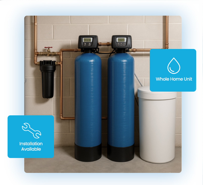 A whole-home water treatment system is installed at your main water line, ensuring every drop that flows through your home — showers, sinks, appliances, drinking water — is filtered and treated before it reaches you.